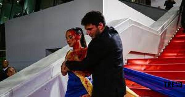 قامت إمرأة بإقتحام السجادة الحمراء ثم سكبت على نفسها سائلاً أحمر مشابهاً للدماء قبل أن يُخرجها رجال الأمن من المكان على ما أفاد صحافيوا وكالة “فرانس برس”،