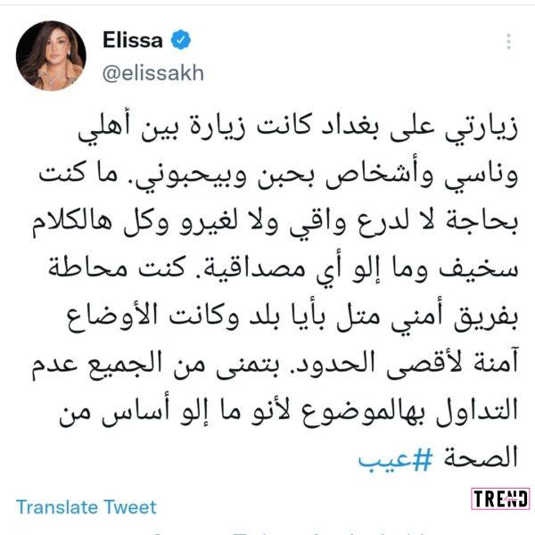 وكتبت إليسا تعليقاً على الموضوع على صفحتها الخاصة عبر موقع “X”، تويتر سابقاً:” زيارتي على بغداد كانت زيارة بين أهلي وناسي وأشخاص بحبن وبيحبوني. ما كنت بحاجة لا لدرع واقي ولا لغيرو وكل هالكلام سخيف وما إلو أي مصداقية. كنت محاطة بفريق أمني متل بأيا بلد وكانت الأوضاع آمنة لأقصى الحدود. بتمنى من الجميع عدم التداول بهالموضوع لأنو ما إلو أساس من الصحة”.